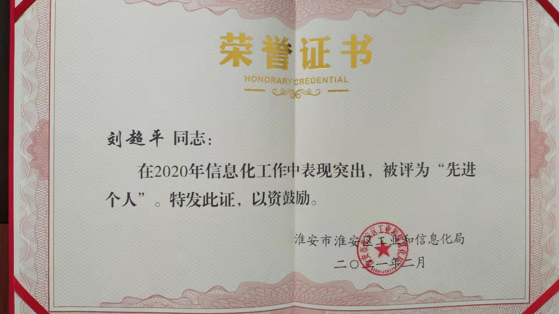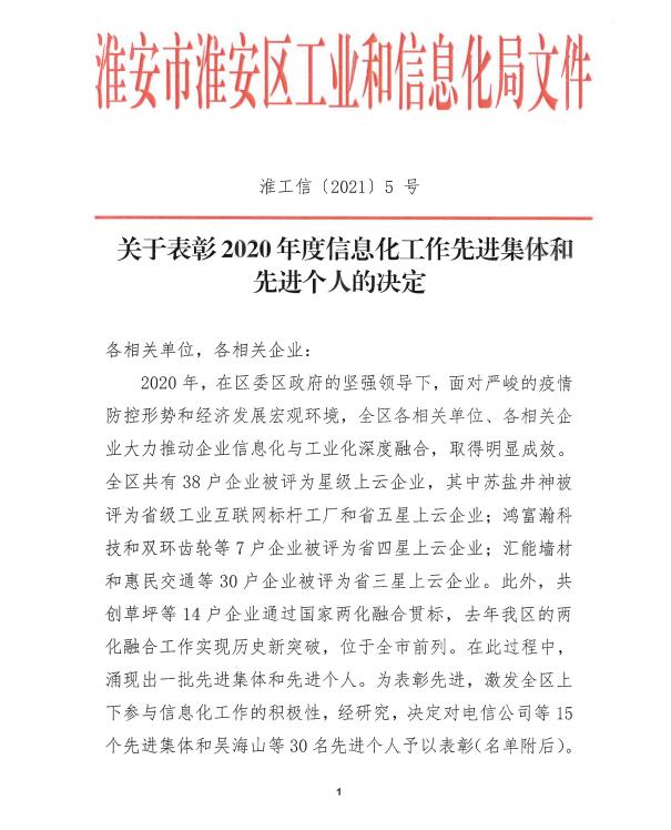 我公司和公司技术总监连续两年分别获得淮安区工信局颁发淮安区信息化工作“先进集体”和“先进个人”称号